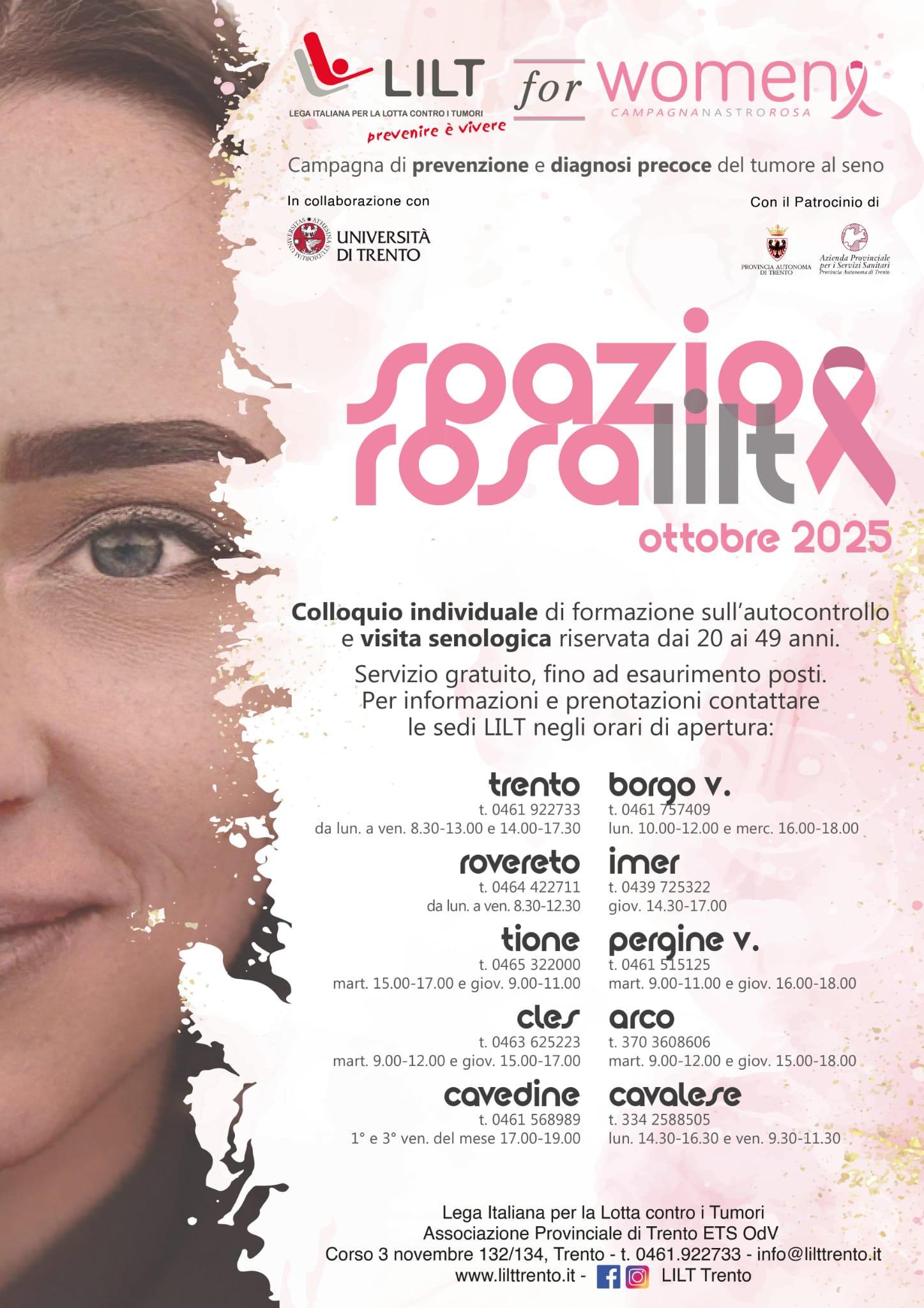 Descrizione Colloquio individuale di formazione sull'autocontrollo e visita senologica riservata dai 20 ai 49 anni.Cavalese 334 2588505lun. 14.30 - 16.30ven. 9.30 - 11.30